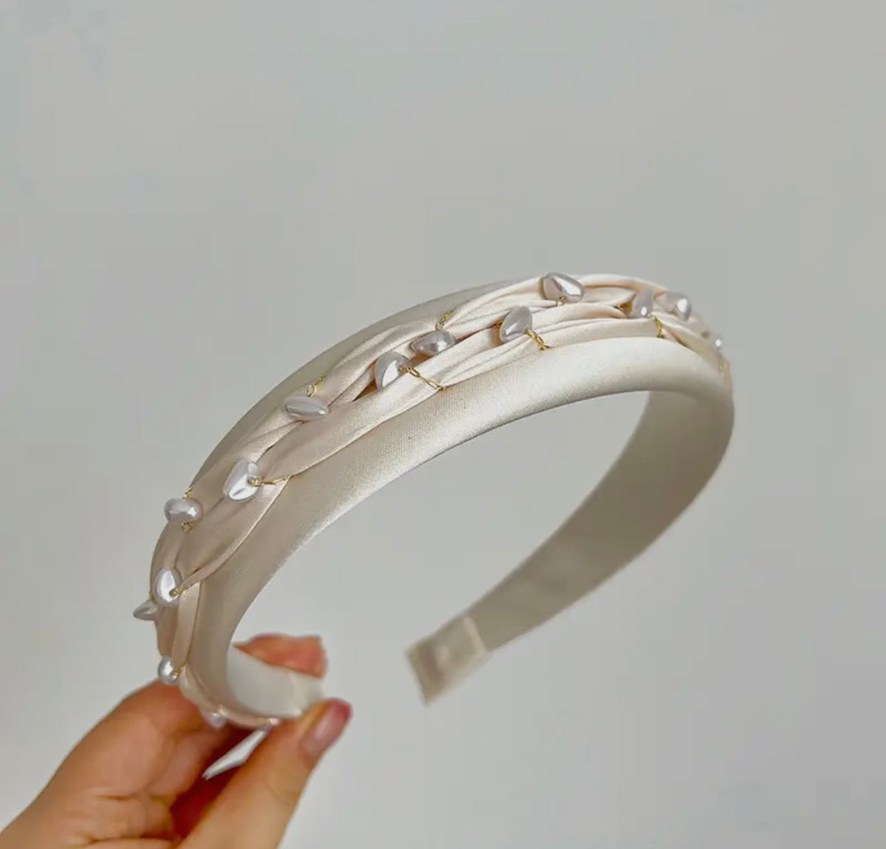 Add a touch of coastal elegance to your look with our satin pearl headband. Featuring a braided gold chain with pearl embellishments.