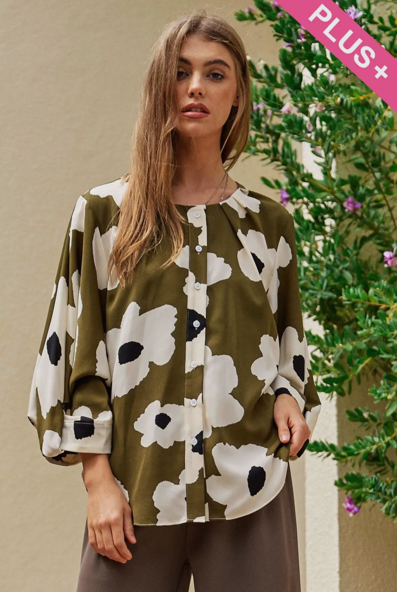 Introducing the Curvy Lovely Blouse, designed for plus size women. This stylish blouse features a button down front, a pleat in the back, and updated sleeve details for a modern look. With 3/4 length sleeves and made from 100% polyester, it offers both comfort and sophistication.