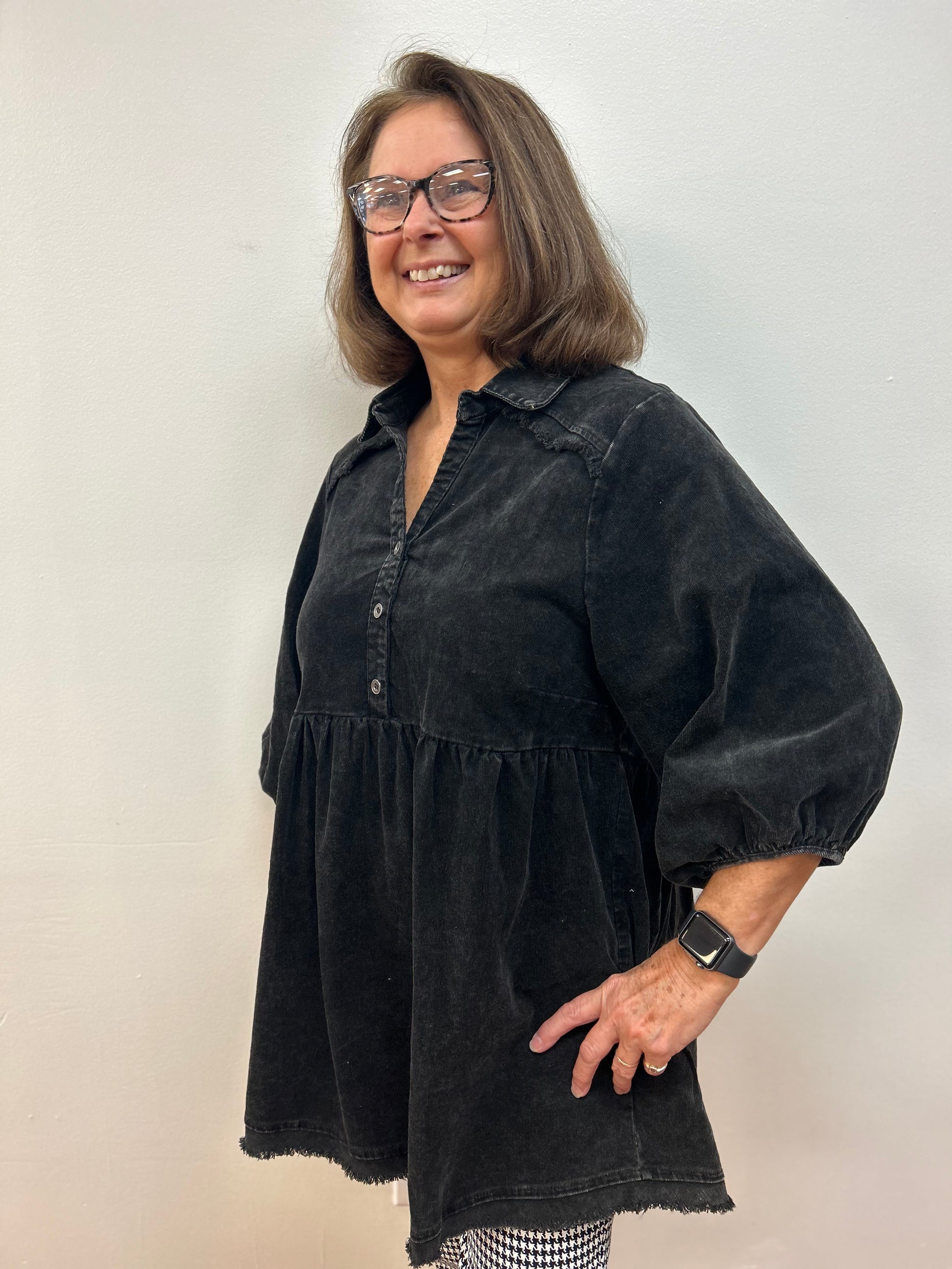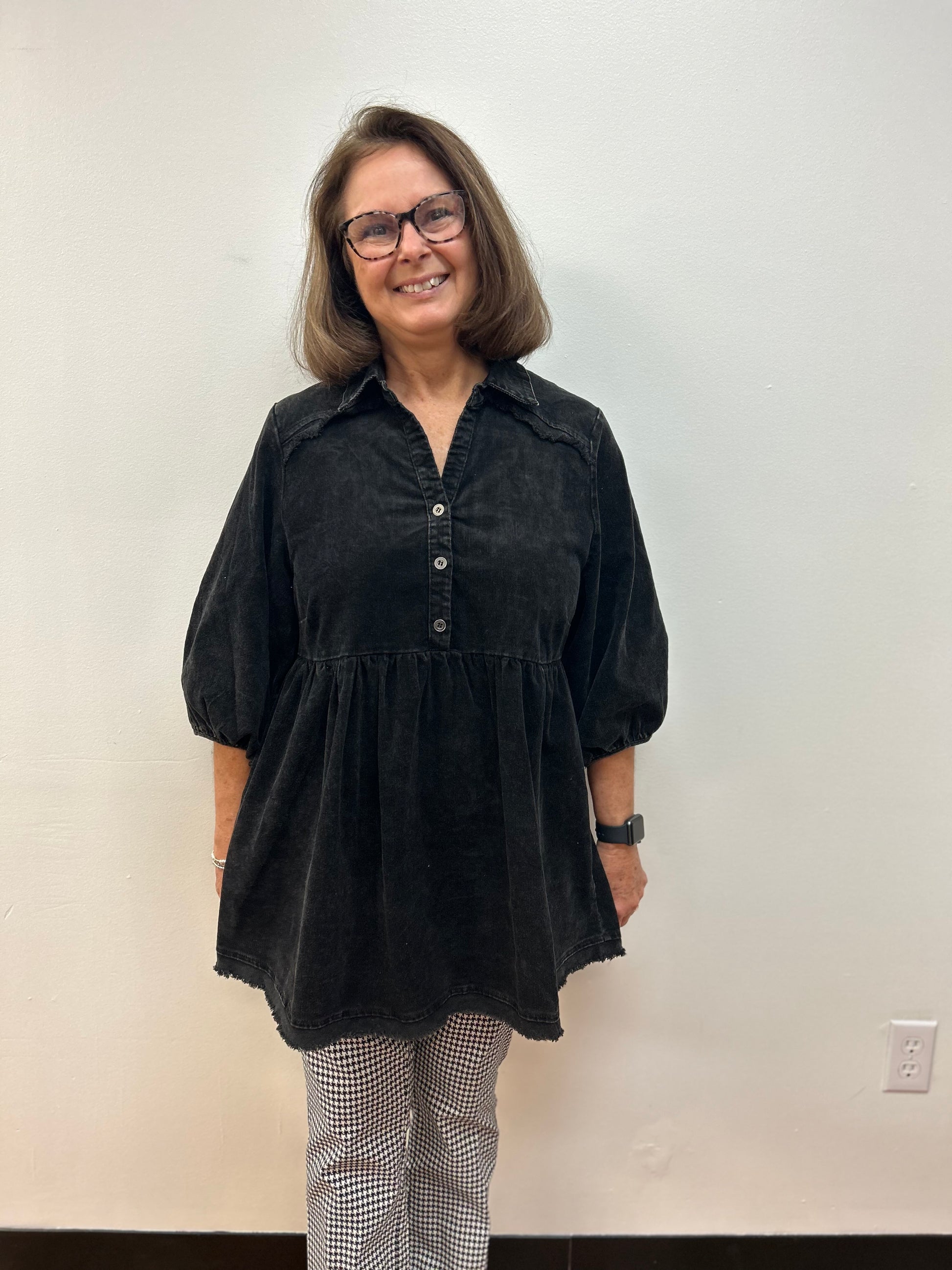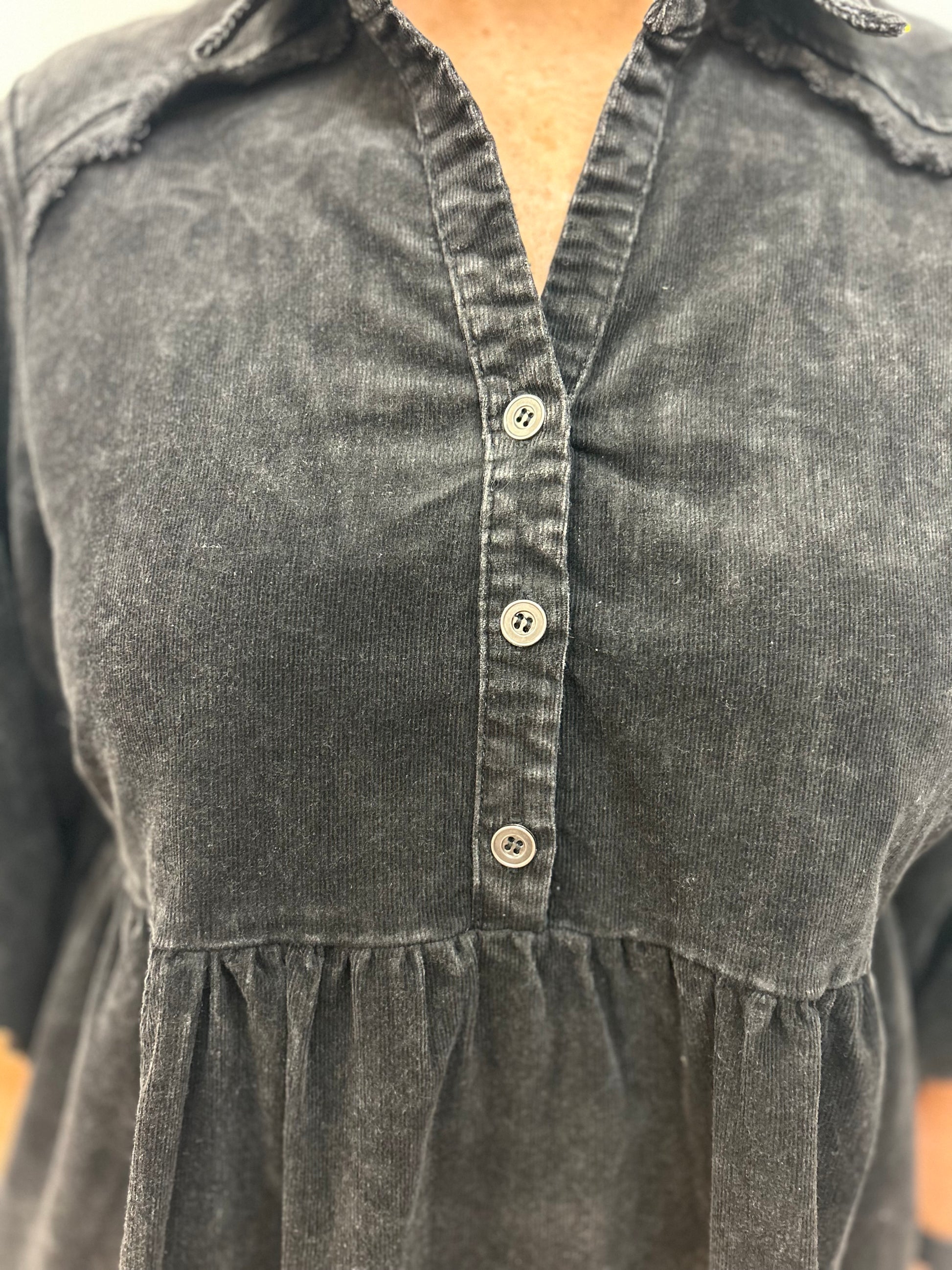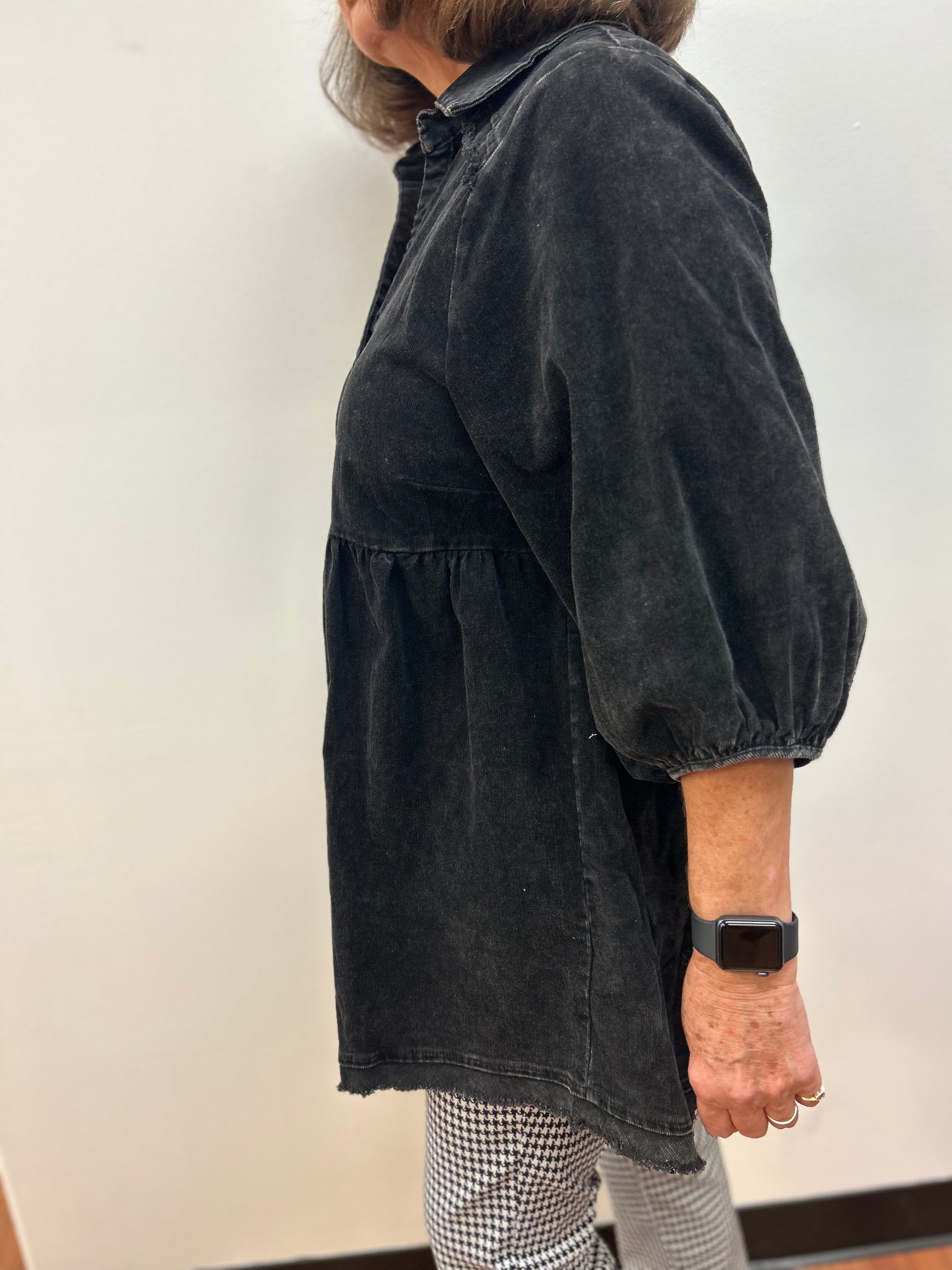 As an industry expert, trust the comfort and style of the Cyndy stone washed corduroy tunic by Umgee. Made from 97% cotton and 3% spandex, this half button down tunic is both chic and comfortable. The classic corduroy material and stone washed finish add a touch of sophistication to your wardrobe.