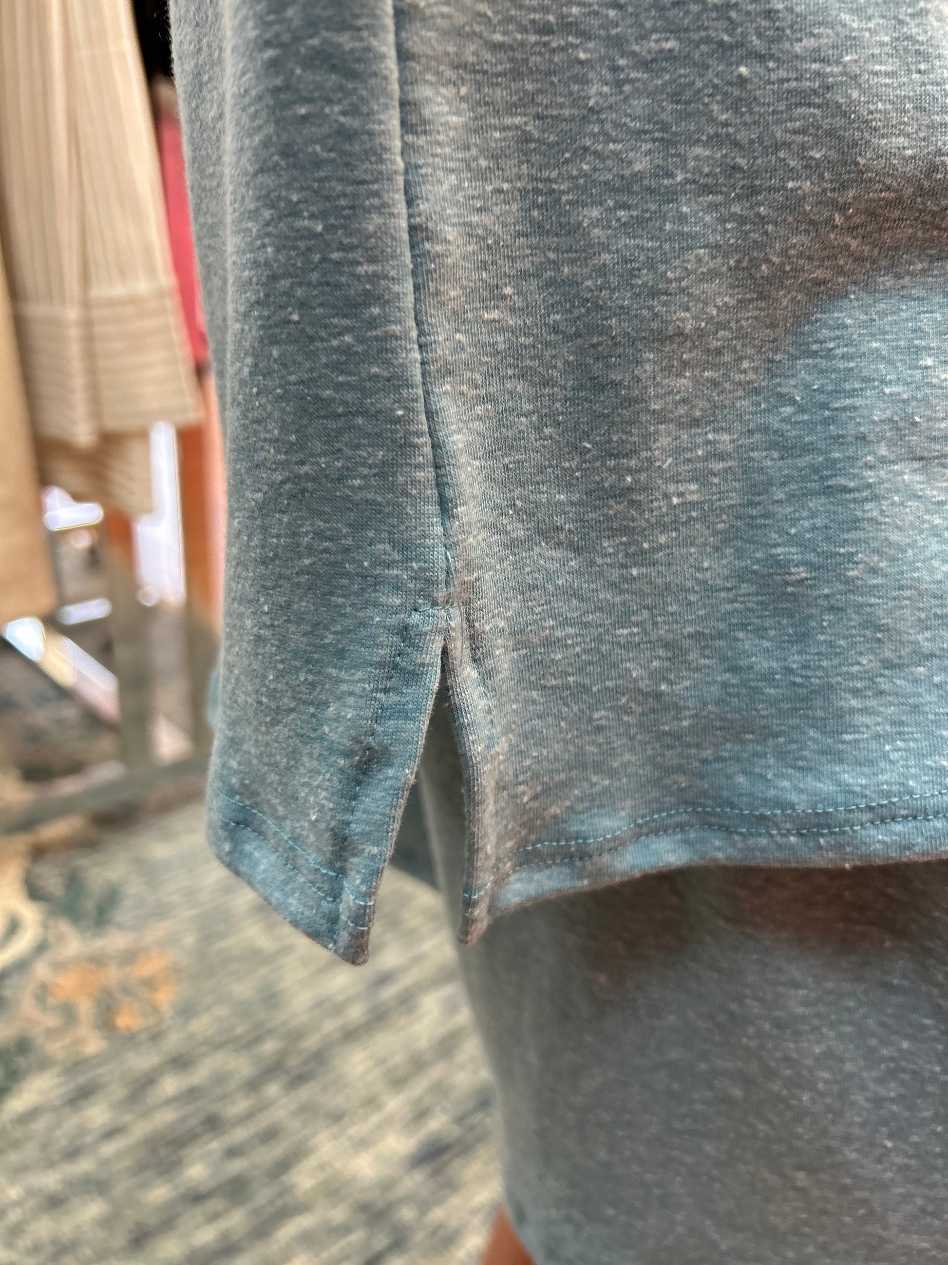 Expertly designed for versatility and comfort, this Good Girl top features a textured blue slub knit fabric, a fold over collared neckline, and drop shoulder short sleeves. With side slits for added mobility, this top is perfect for any occasion.