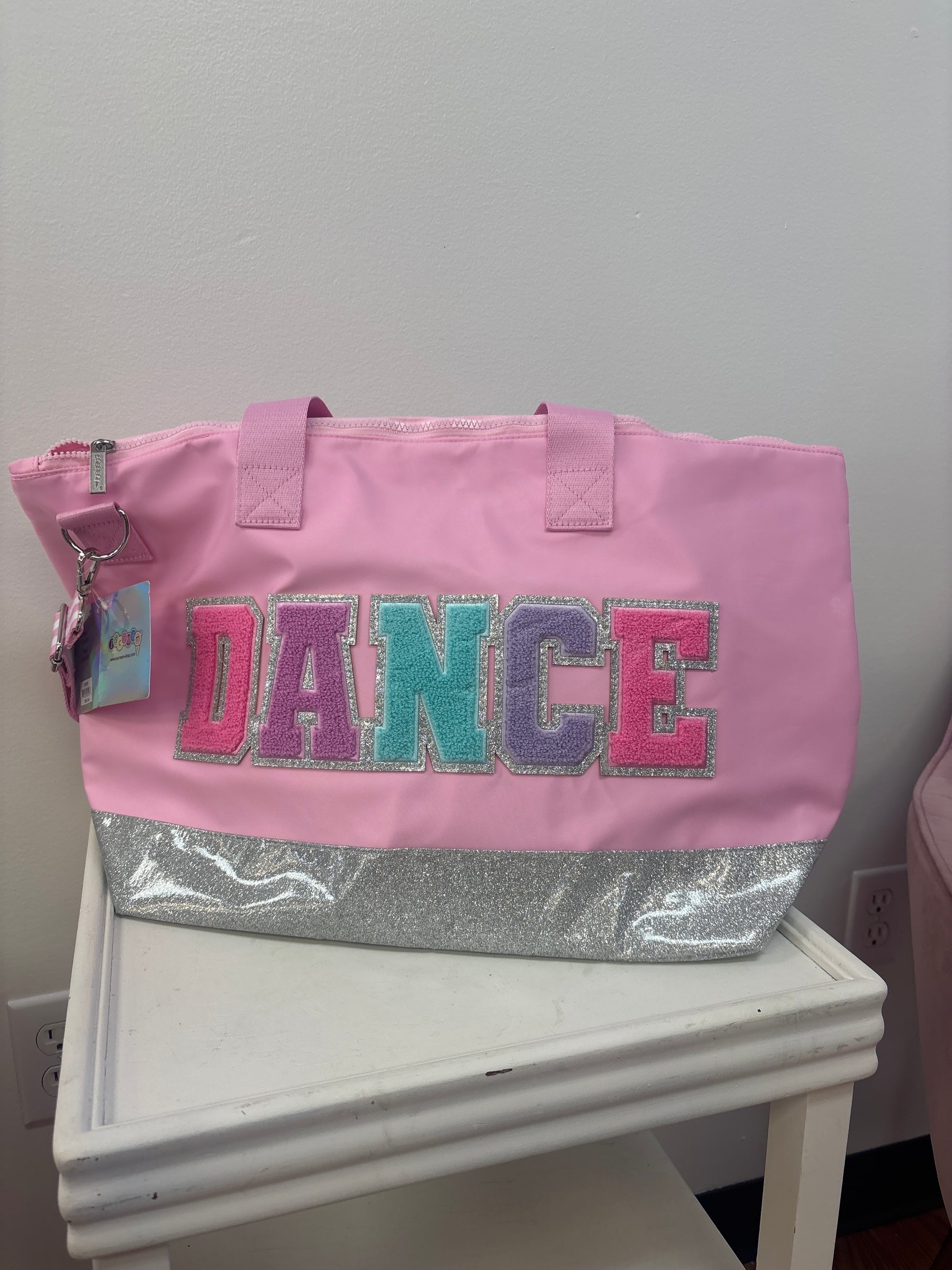 - Pink and silver glitter contrast with DANCE in colorful chenille lettering