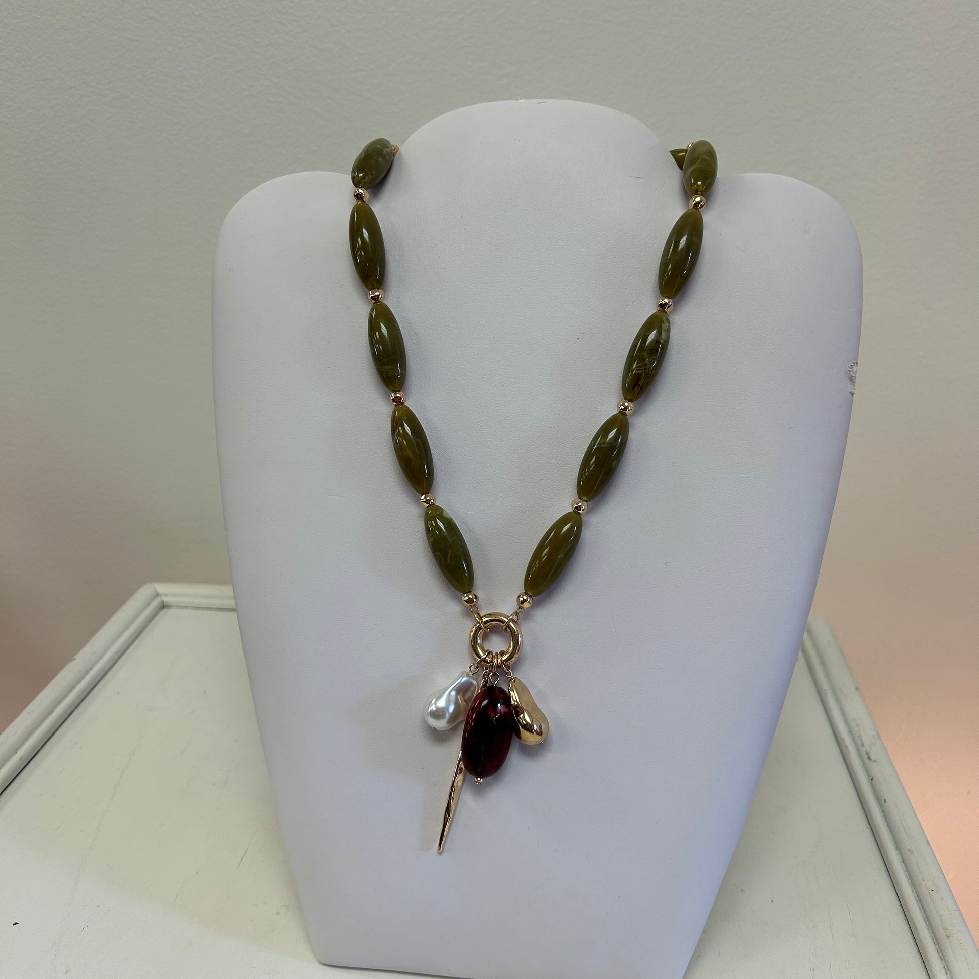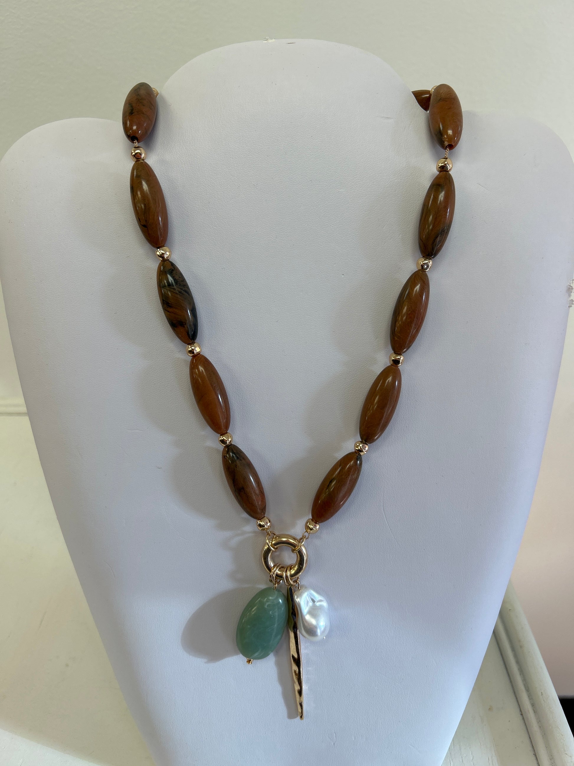 Elevate your look with this charming beaded necklace featuring gold spacers and delicate gold and pearl charms. Available in olive green or shades of brown. Part of a coordinating set with matching earrings and bracelet available.