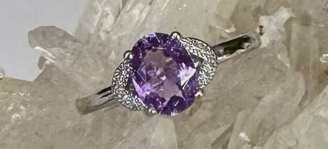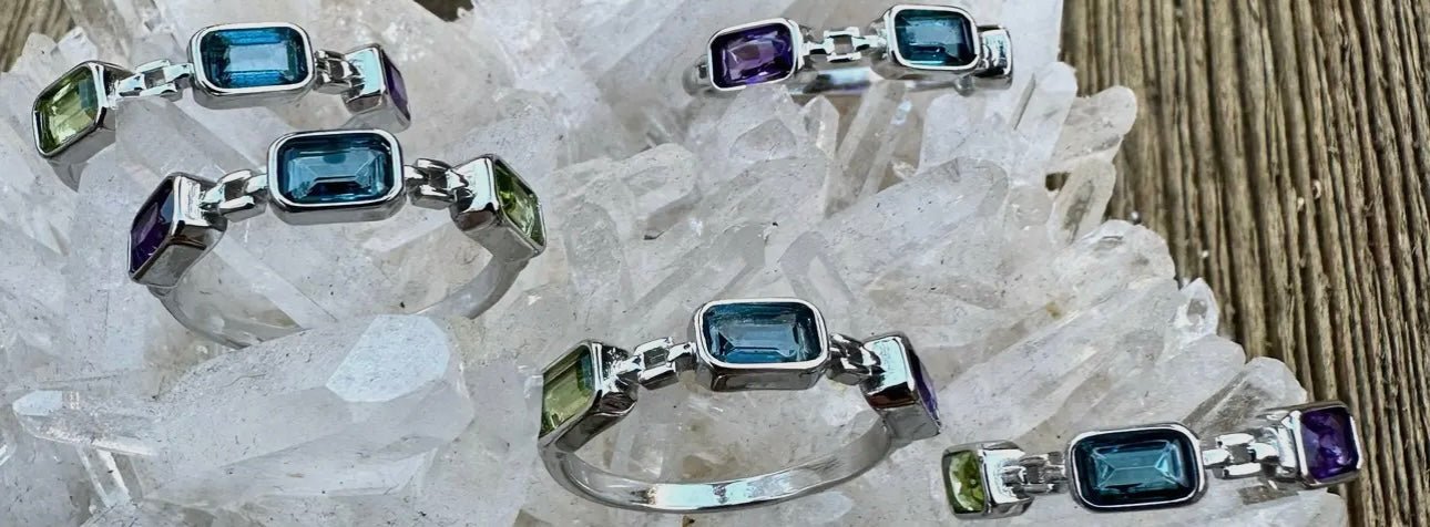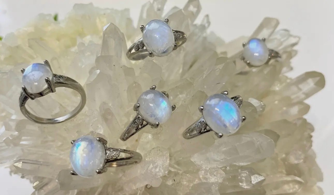 These beautiful natural stone and crystal rings are set in a white bronze.  White bronze is hypoallergenic and does not contain lead. Rings are available in sizes six through nine. By one or all of them to match every mood.