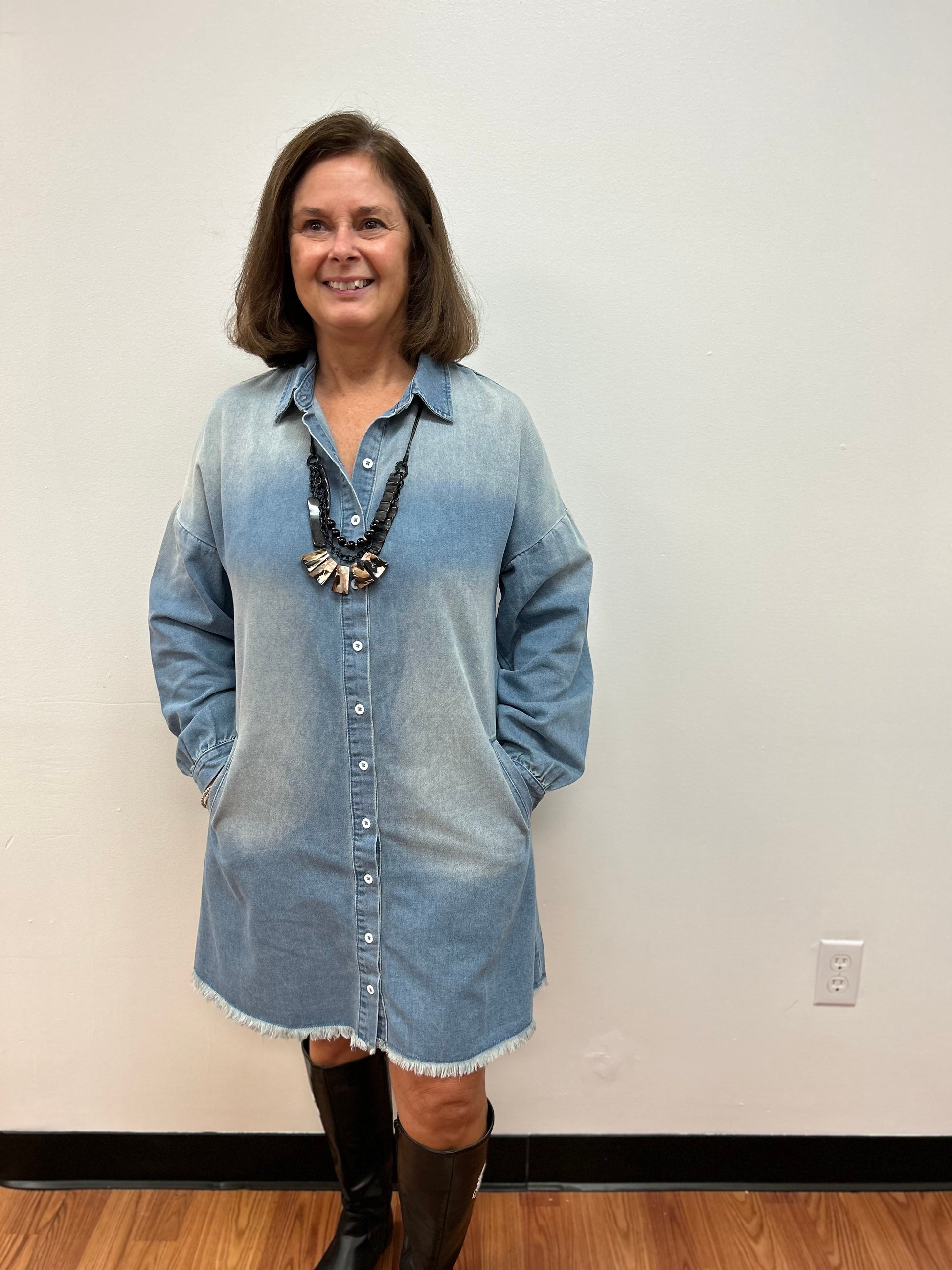 Expertly crafted with 82% cotton, 10% polyester, and 8% viscose, the Risen Denim Shirt Dress boasts a button front, knee length, and long sleeves with a frayed hem. Versatile in design, it can be worn as a dress or a stylish duster. Keep your essentials close with side pockets and enjoy the relaxed fit of the drop shoulder.