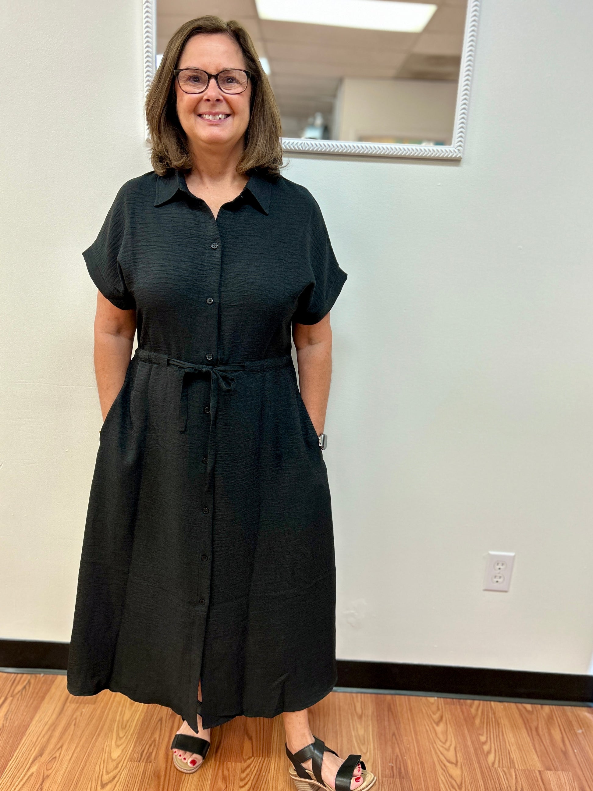 Short sleeve collared button down midi dress with an adjustable drawstring waist and pockets. Cape cod lined look poly fabric. Cool fabric, and classic style.