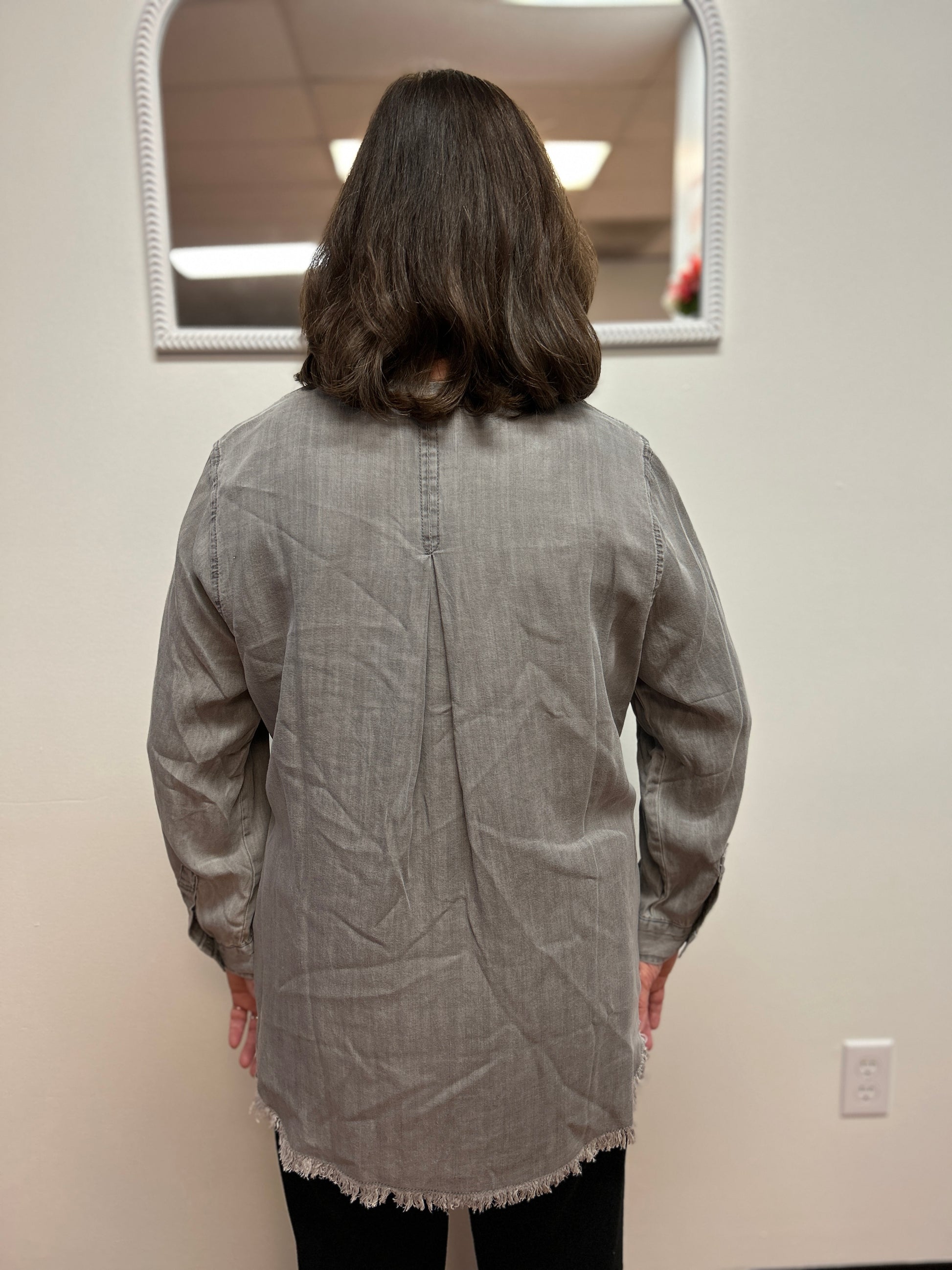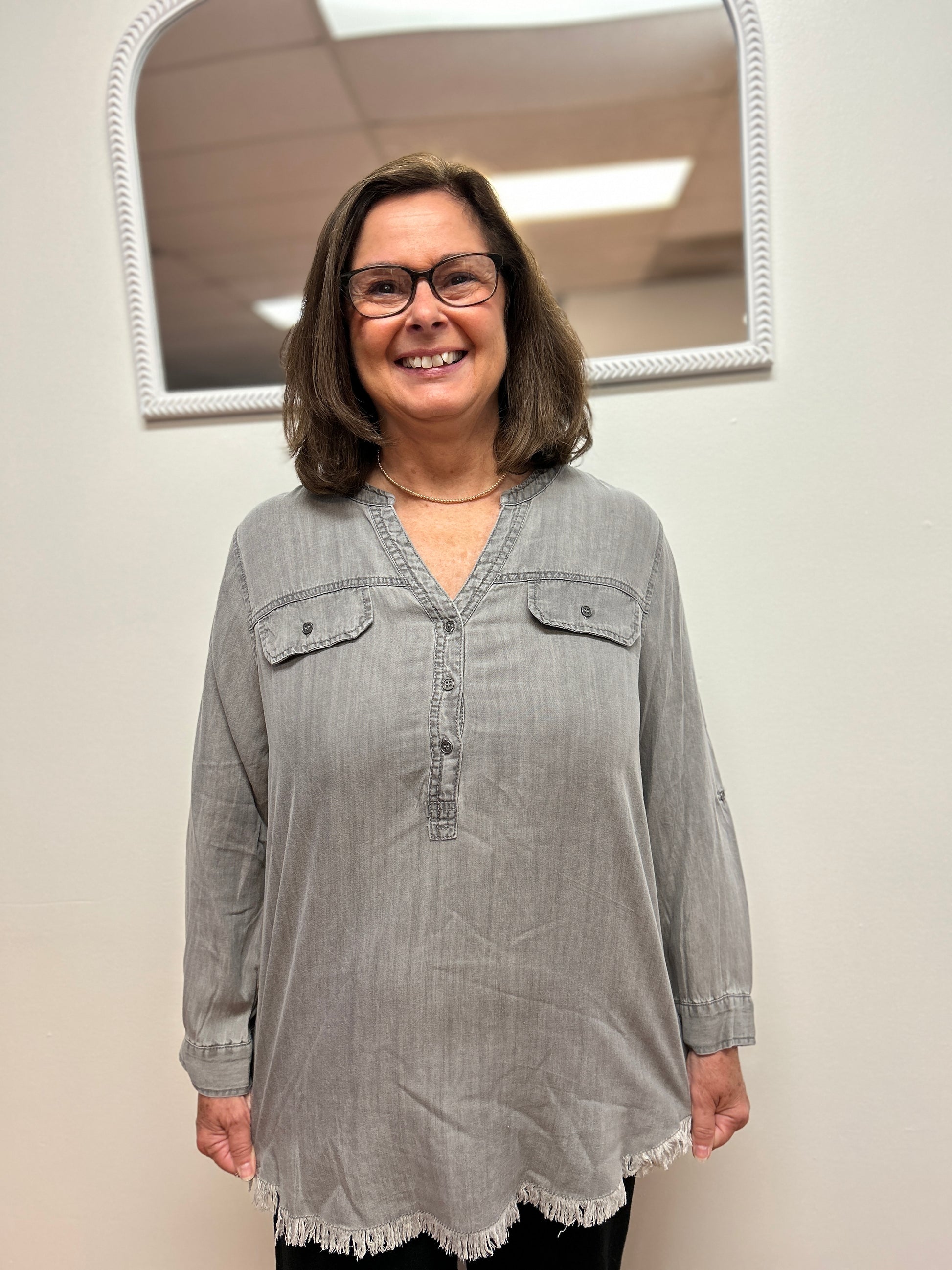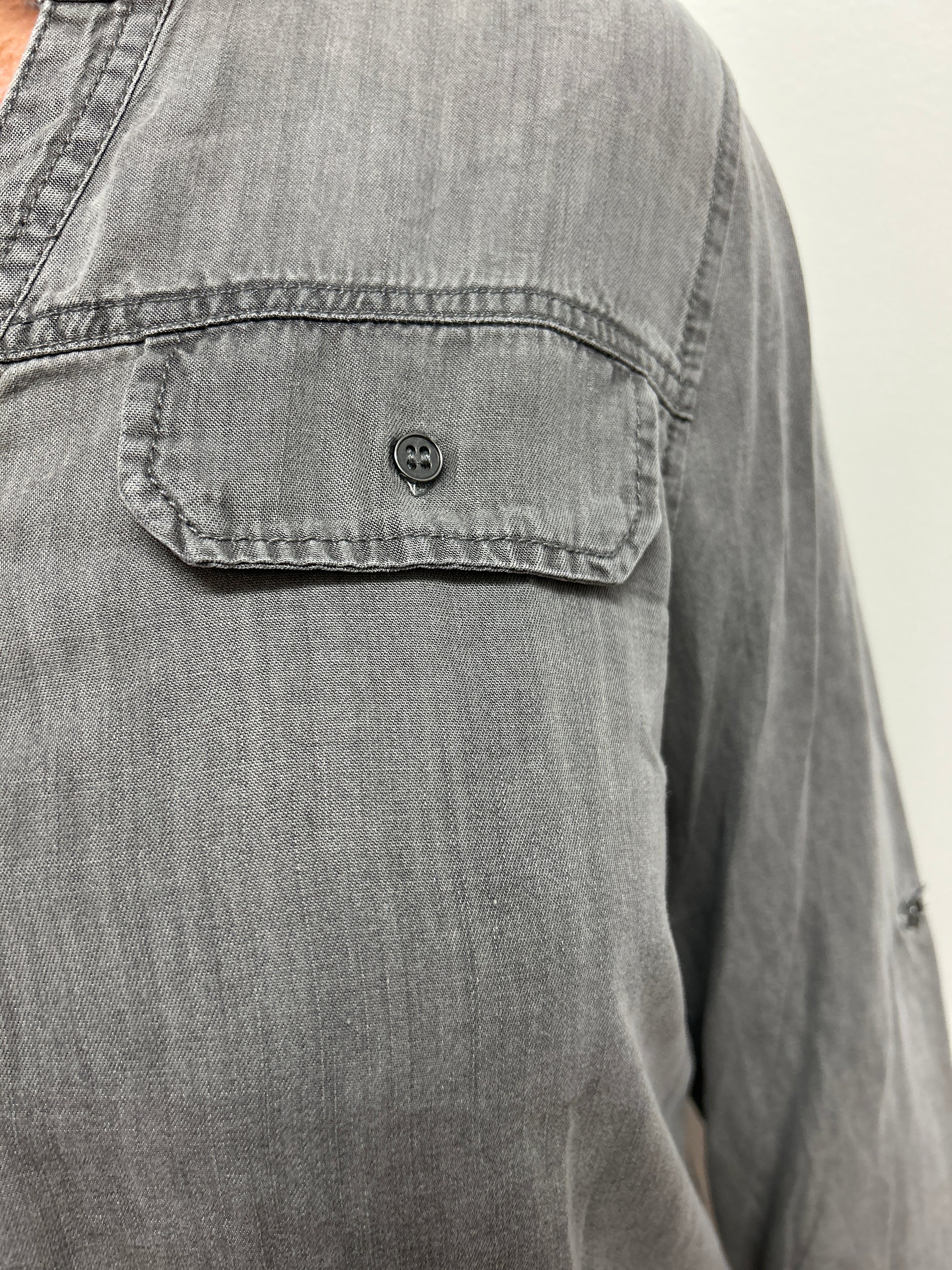 Our Totally Tencel Blouse features a split neckline, fringed hem and roll up button sleeve. Versatile and comfortable for all seasons.