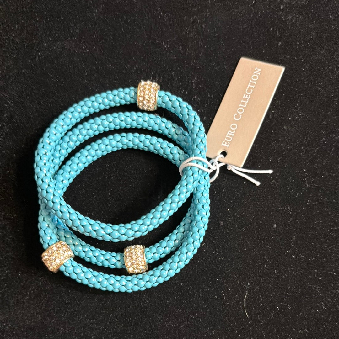 These blue wire mesh bracelets are dressed up with rhinestone rings. Perfect for dressing up or down. You will not want to miss these.