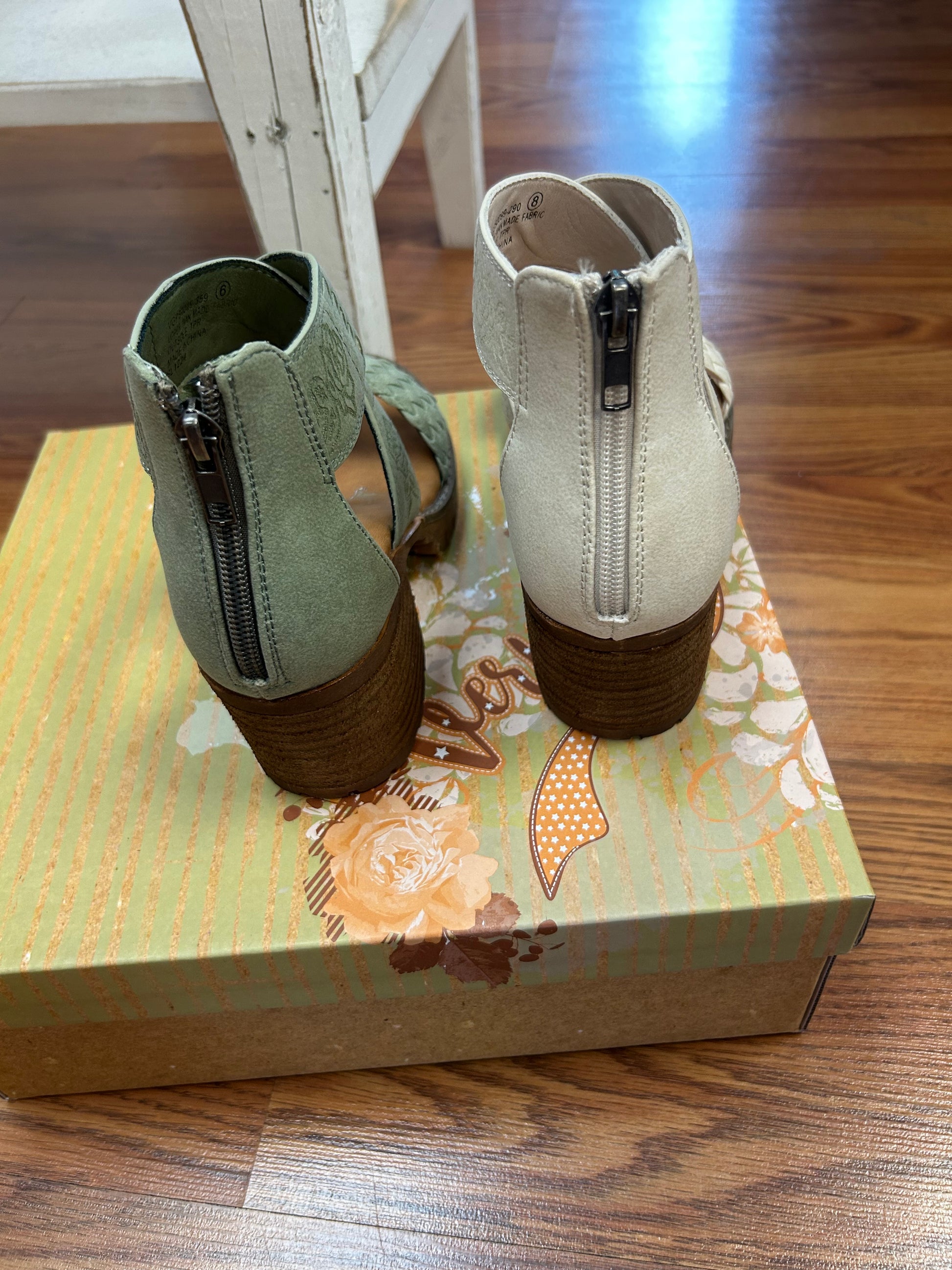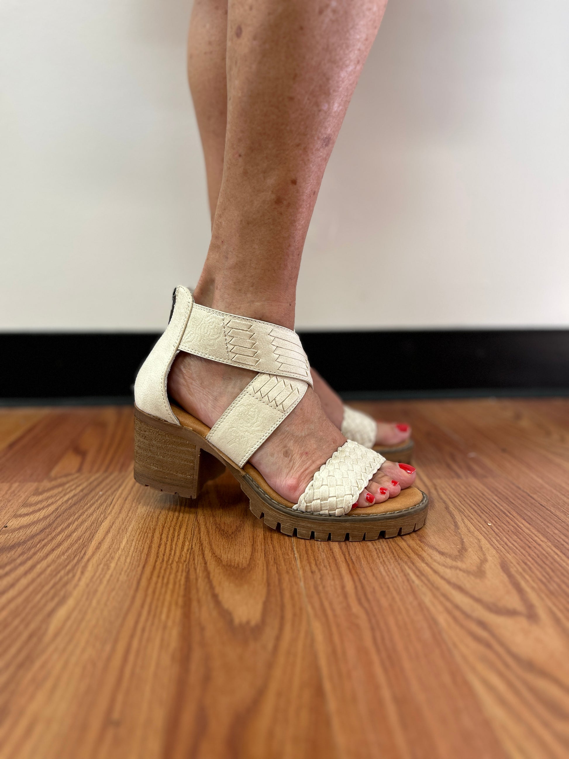 Step into a world of playful style with Vana by Very G. These open-toed pumps feature a unique floral emboss and woven detail, adding a touch of whimsy. Crafted from faux leather, they also boast a comfortable leather stacked heel. Perfect for adding a quirky flair to any outfit.